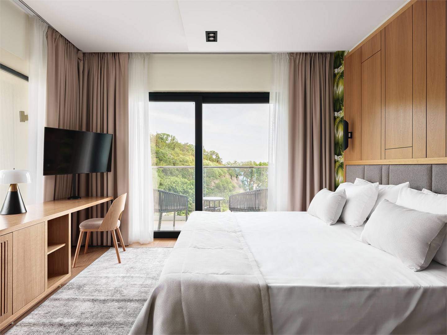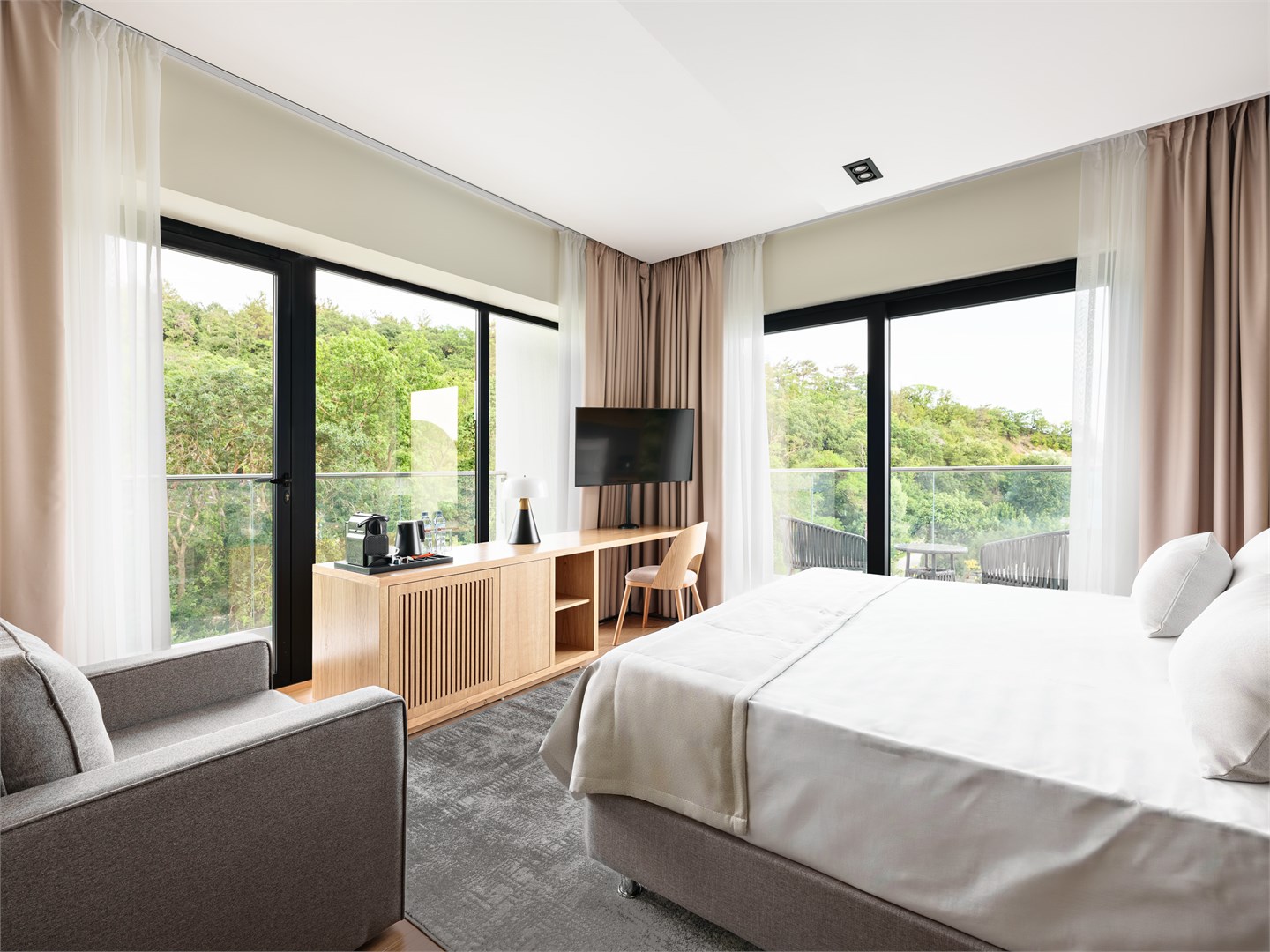 Просторный 3-местный номер с панорамным остеклением и балконом. Номер имеет вид на море. Кровати трансформируется в одну 2-спальную или две 1-спальные кровати шириной 90 см. В качестве третьего места предлагается раскладное кресло-кровать. Возможно размещение ребенка до 3 лет в детской кроватке.